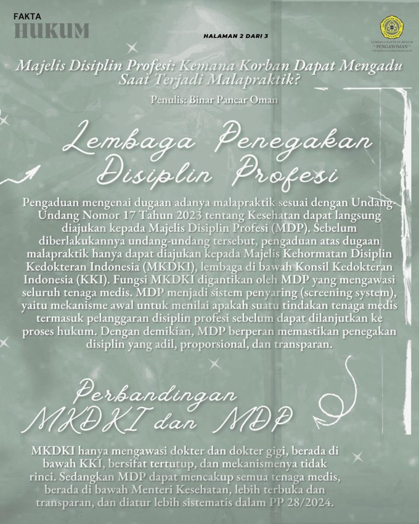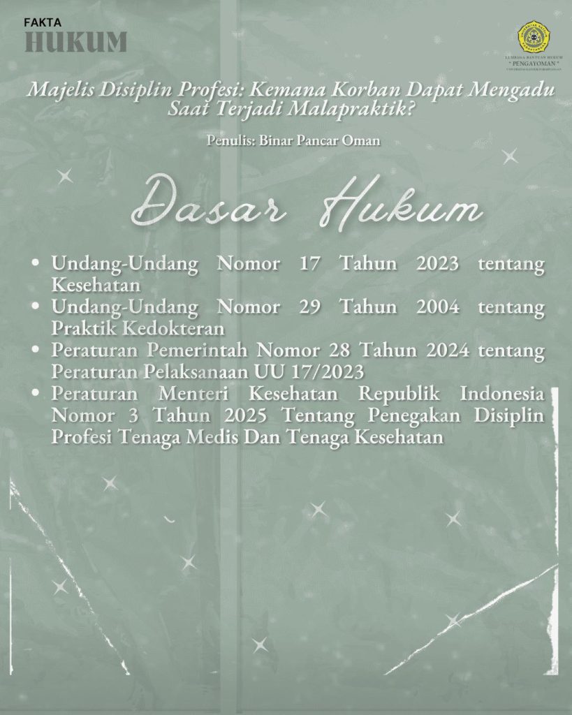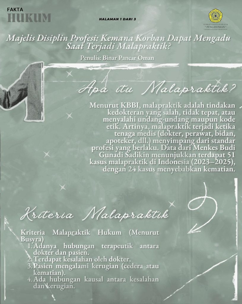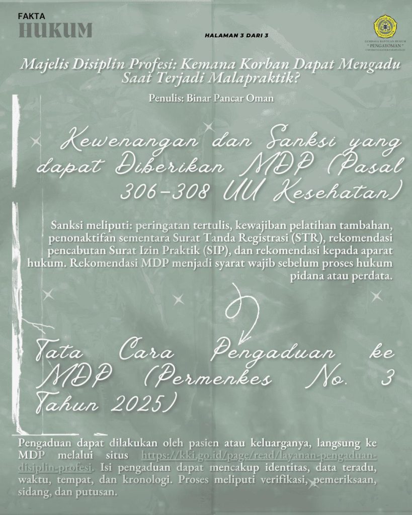 [1] Gede Arga Adrian, Malapraktik Berulang di Indonesia Bukan Sekadar Angka, https://www.ums.ac.id/berita/teropong-jagat/malapraktik-berulang-di-indonesia-bukan-sekadar-angka, (diakses pada 17 Oktober 2025).