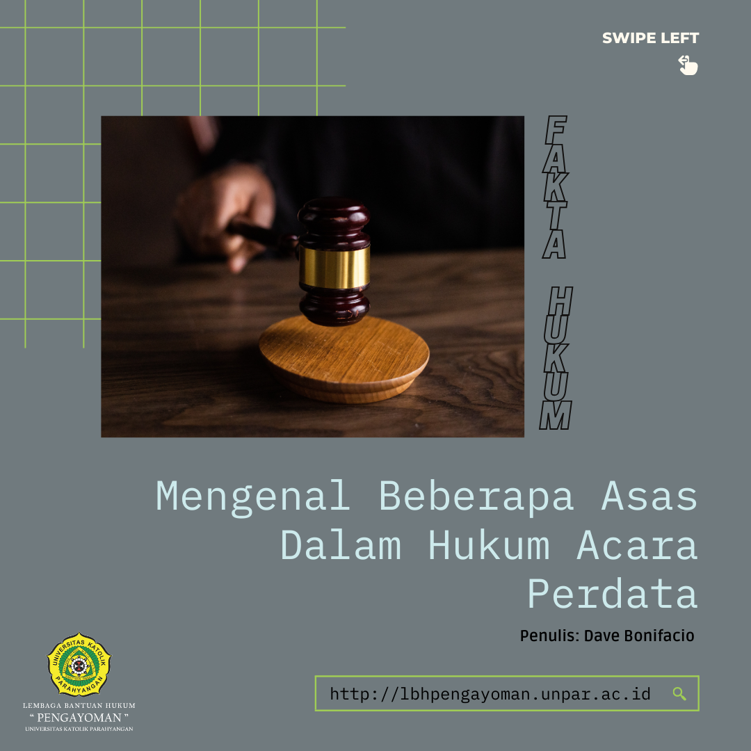 Adapun dalam hukum acara perdata terdapat beberapa asas yang berlaku yaitu: 1) hakim bersifat menunggu, 2) hakim pasif, 3) sifat terbukanya persidangan, 4) mendengar kedua belah pihak, 5) putusan harus disertai alasan-alasan, 6) beracara dikenakan biaya dan 7) tidak ada keharusan mewakilkan.[2] Asas yang pertama, hakim bersifat menunggu, berarti bahwa segala ajuan tuntutan hak sepenuhnya diserahkan pada pihak yang berkepentingan. Apabila tidak ada tuntutan hak atau penuntutan, maka tidak ada hakim yang mengurus perkara (Wo kein Klager ist, ist kein Richter; nemo judex sine actore).[4] Berikutnya, dalam memeriksa perkara, hakim harus bersikap pasif yang artinya adalah ruang lingkup atau luas pokok sengketa yang diajukan ditentukan oleh para pihak yang berperkara, bukan oleh hakim. Hal ini merupakan ketentuan yang diharuskan dalam asas hakim pasif. Asas hakim pasif juga dikenal sebagai asas ultra petita non cognoscitur yang menghendaki hakim untuk hanya menimbang hal-hal yang diajukan para pihak dan tuntutan hukum yang didasarkan padanya. Dengan kata lain, hakim hanya menentukan hal-hal yang diajukan dan dibuktikan para pihak, sehingga hakim dilarang menambah maupun memberikan lebih dari yang diminta para pihak.[5] Sebagai contoh, apabila hakim ditugaskan dengan suatu kasus Wanprestasi yang ternyata disertai penipuan, hakim tersebut hanya diperkenankan mengadili perkara Wanprestasinya saja. Selain itu, persidangan yang dilaksanakan juga harus terbuka untuk umum, sehingga setiap orang diperbolehkan untuk hadir dan mendengarkan pemeriksaan di persidangan. Adapun keterbukaan yang dimaksud dalam asas tersebut dilakukan guna memberi perlindungan hak-hak asasi manusia dalam peradilan dan menjamin objektivitas agar hakim bersikap adil serta tidak memihak.[6]